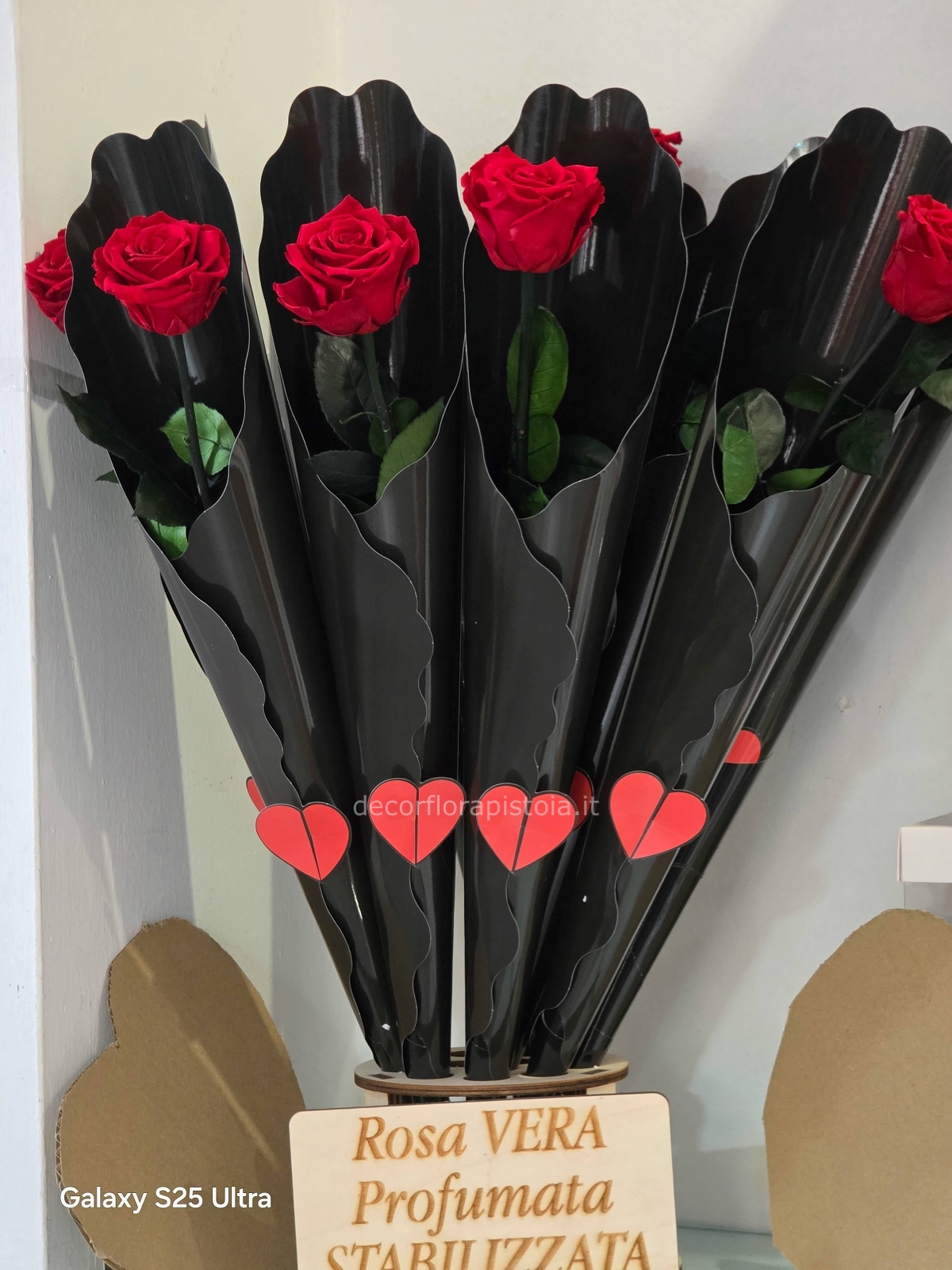 Rosa rossa a stello lungo stabilizzata incartato in cono nero e cuoricino per san valentino